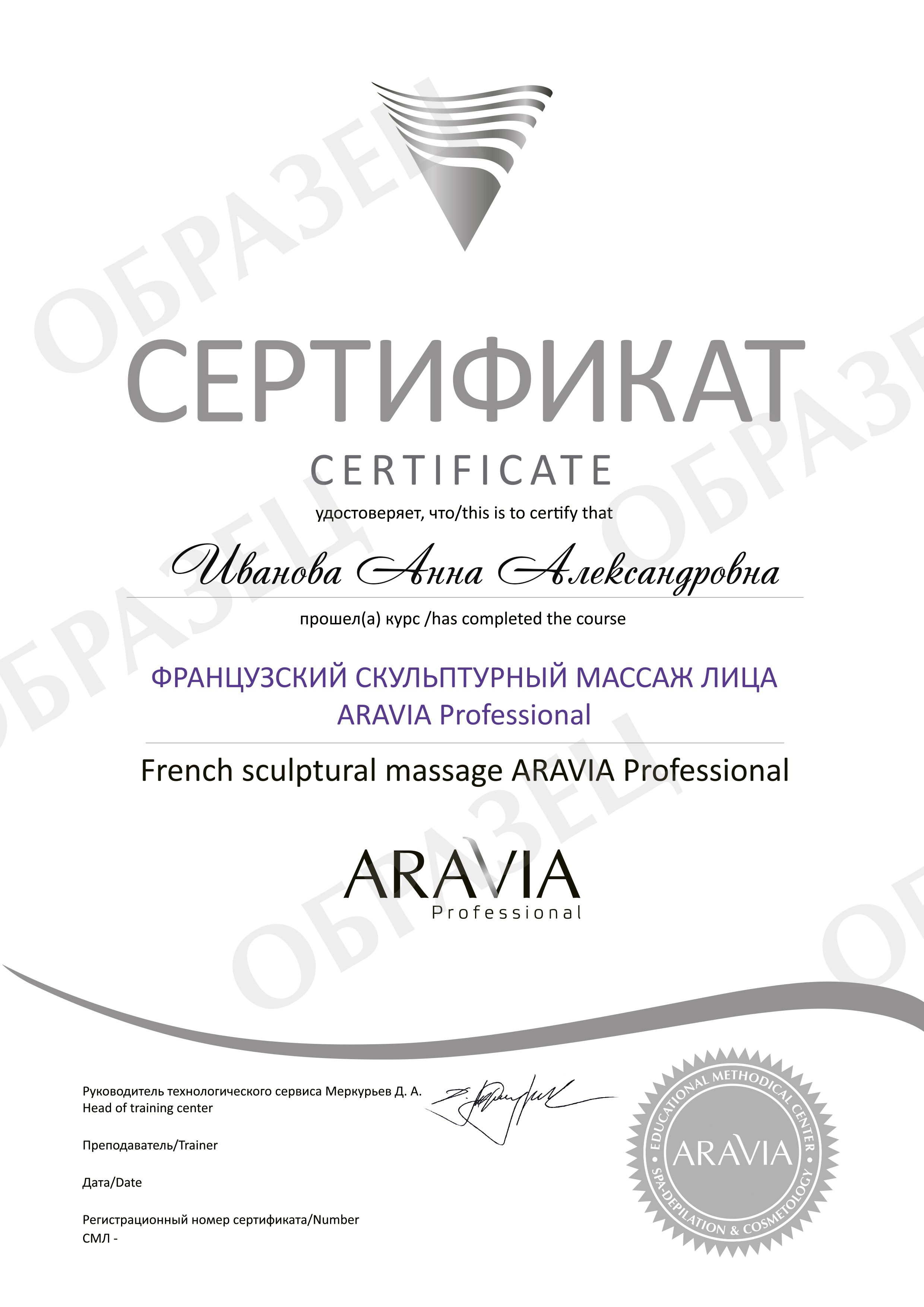 После прохождения курса участники получат методическое пособие косметолога ARAVIA Professional, пособие по массажу и именной сертификат о прохождении обучения по направлению «Французский скульптурный массаж лица ARAVIA Professional».