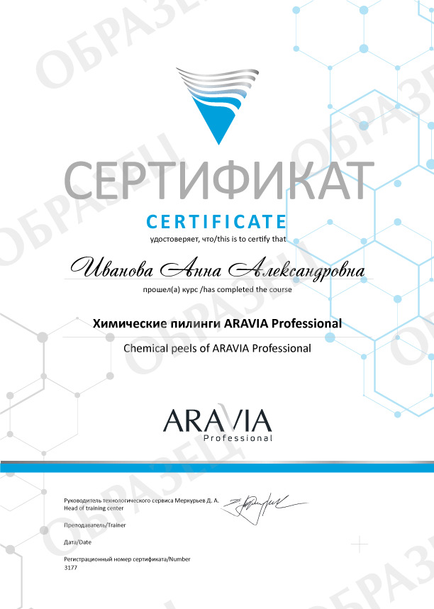 После прохождения курса участники получат методическое пособие «Химические пилинги ARAVIA Professional», буклет «Пилинги-биоревитализанты RENEW BIOPEEL ARAVIA Professional», каталог продукции, прайс-лист и коммерческий сертификат о прохождении обучения по направлению «Химические пилинги ARAVIA Professional».